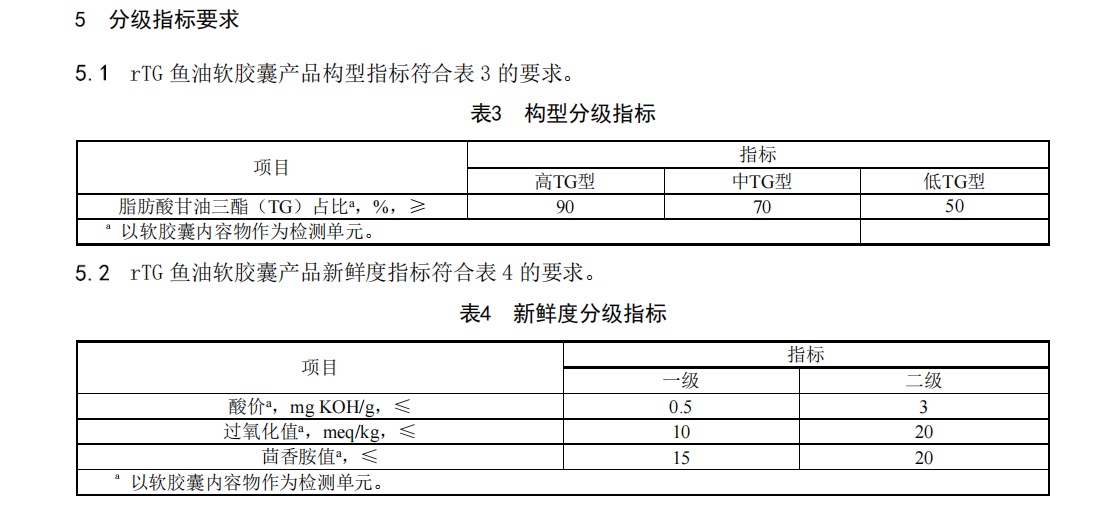 构型方面,标准按TG占比分为高TG型、中TG型、低TG型三个级别,占比越高抗氧能力越强;新鲜度方面,用酸价、过氧化值、茴香胺值三项关键指标衡量产品氧化酸败程度,并划定一级、二级两个等级,一级新鲜度要求最大程度保留Omega-3活性成分。两大维度交叉组合,形成“高rTG型一级新鲜度”“中rTG型二级新鲜度”等共六种产品分级标识。