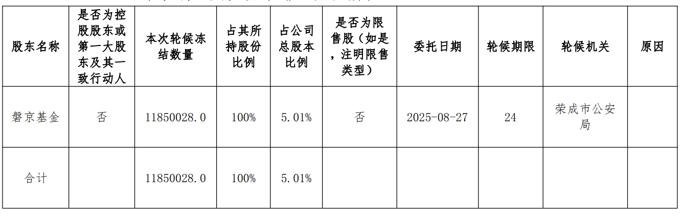 9月26日晚间,西安旅游发布公告,公司持股5%以上的股东磐京基金的股份被轮候冻结。具体情况为,磐京基金的1185万股股份被轮候冻结,占其所持股份比例100%,占公司总股本比例5.01%。该轮候冻结的委托日期为2025年8月27日,轮候期限为24个月,轮候机关为荣成市公安局。