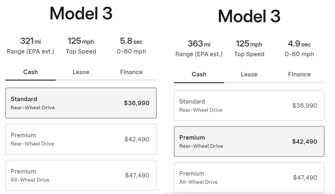 据特斯拉美国官网以及社交媒体用户反馈的信息显示,新车续航里程较老款或将缩短40英里,0-100km/h加速时间将延长近1秒,Autopilot辅助驾驶功能也或被取消。细节配置上,方向盘和外后视镜改为手动调节,前排座椅通风、后排座椅加热功能被直接取消,座椅材质从皮质换成纯仿皮或织物材质,原本的15个扬声器音响系统缩水为7个。