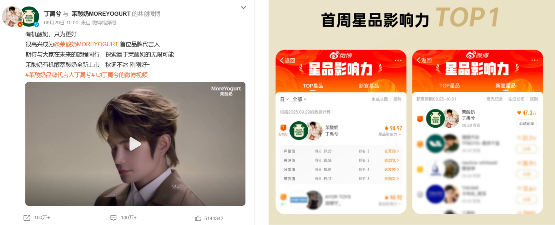9月30日,茉酸奶代言人官宣微博转发破百万。在微博“星品影响力”榜单上,“茉酸奶&丁禹兮”的组合拿下了“TOP星品”与“新宣新品”双料第一。在评论区,“本来冲人买的,结果被牛油果绿菠酸奶圈粉了”等声音也越来越多。