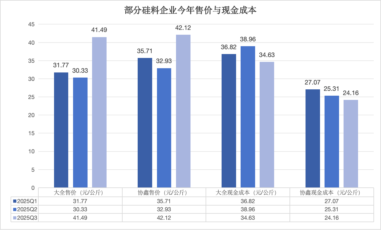 对比两家企业披露的数据不难发现,二者今年三季度硅料售价均出现了显著回升。三季度大全能源多晶硅单位销售价格出现回升,为41.49元/公斤,环比增长近40%。协鑫科技三季度颗粒硅售价42.12元/公斤,环比增长近30%。