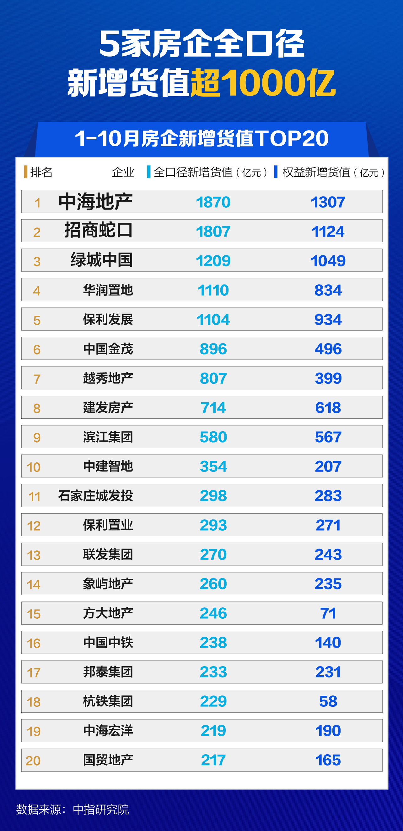 从新增货值来看,1-10月,中海、招商和绿城位列前三。其中,中海以1870亿元新增货值位列第一,招商、绿城新增货值规模分别为1807亿元和1209亿元,分列第二和第三位。而在1-9月的排名中,前三位为绿城、保利发展和中海。