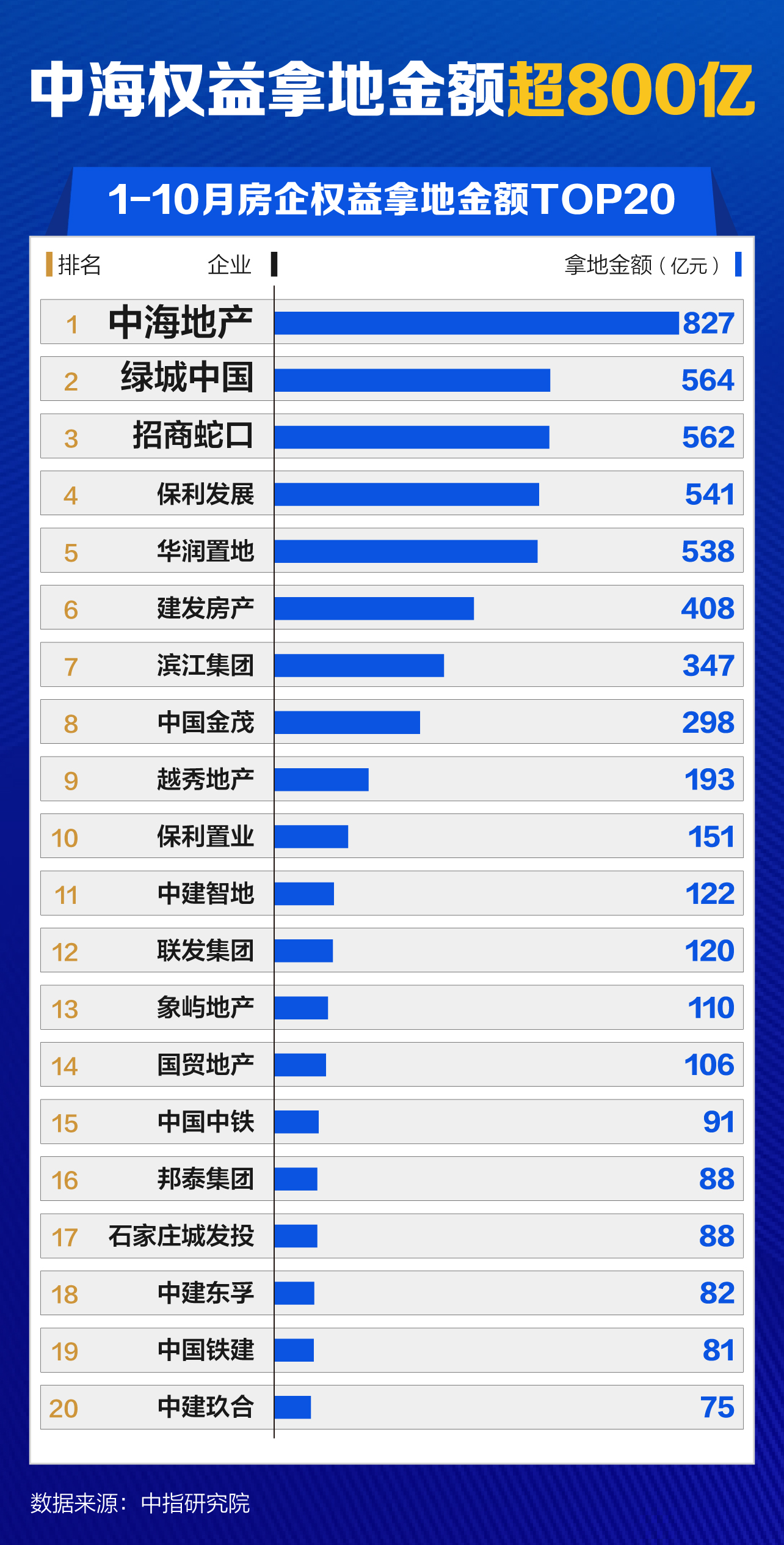 权益拿地金额方面,1-10月,中海、绿城、招商分别以827亿元、564亿元、562亿元位居前三名。