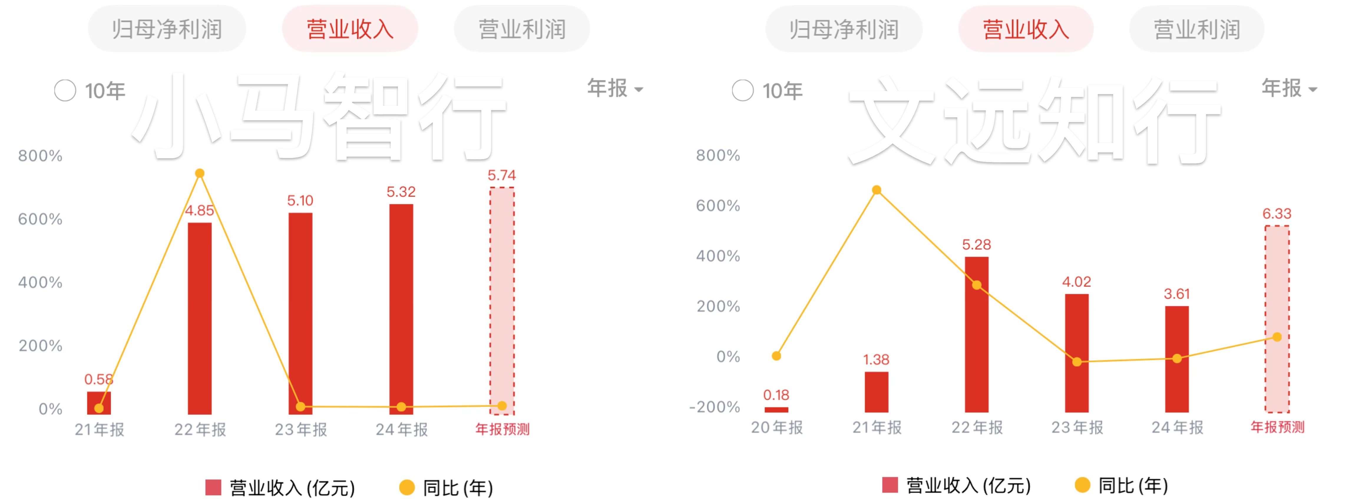 小马智行与文远知行营收对比,单位人民币。数据来源:万得