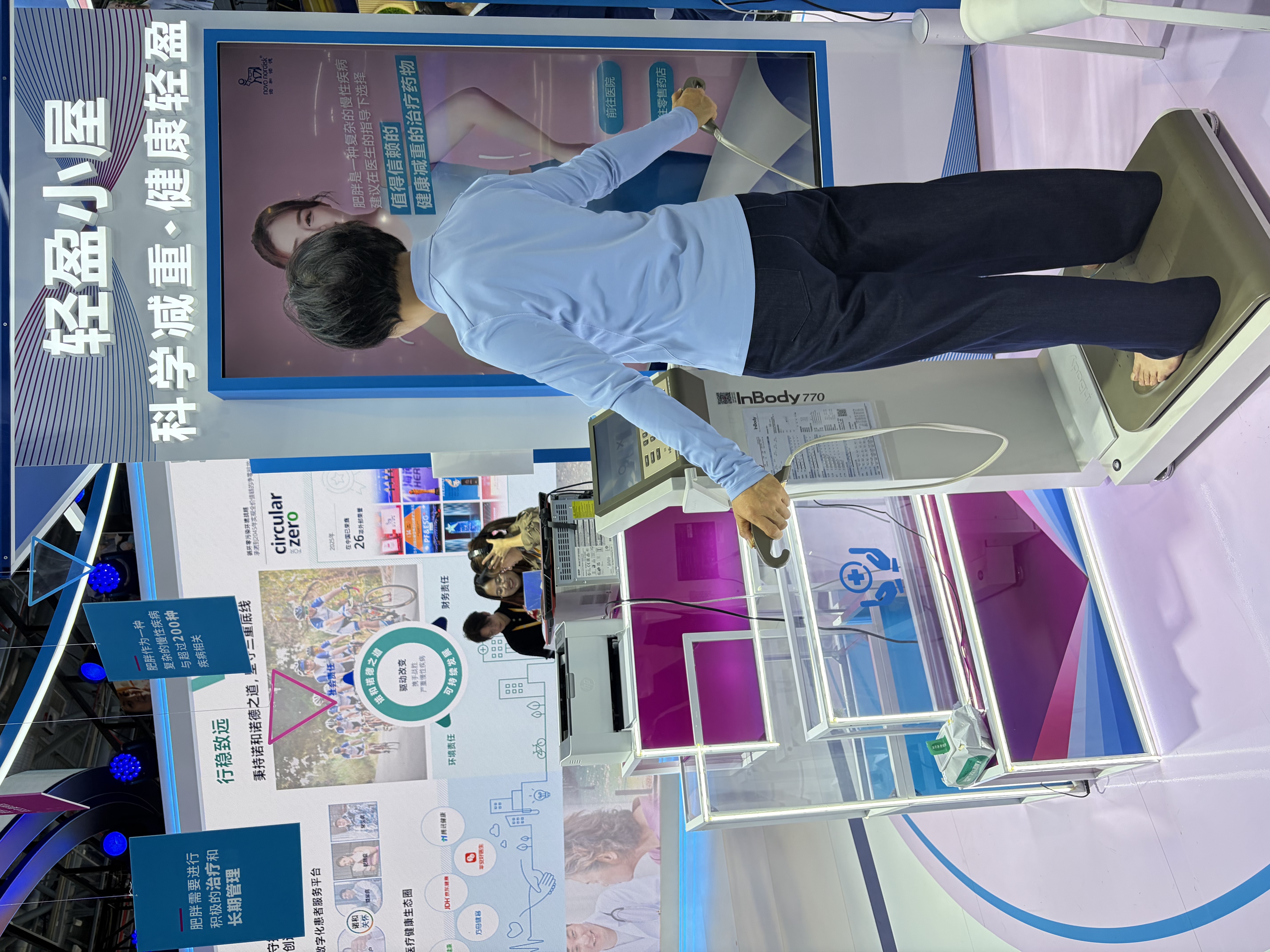 诺和诺德则在进博会展台打造了首个聚焦肥胖症管理的沉浸式体验空间——轻盈小屋,通过“认知提升、科学治疗、长期管理”全周期场景的体验,推动公众从“被动接收肥胖症知识”向“主动学习和积极管理肥胖症”转变,用更加生动的互动体验,提升公众对肥胖症科学诊疗和长期管理的认知。在“认知提升”场景中,公众可通过AI视觉识别互动技术看见“变胖的自己”,结合相应的科普知识及健康风险提示,唤醒对肥胖症的重视。“科学治疗”部分包括医院与零售两大场景,旨在展示“院店协同”新模式,助力打通肥胖症院内外管理闭环,提升肥胖症管理的便利性、科学性与依从性。该区域摆放了一台人体成分分析仪,吸引了不少人驻足测试。“长期管理”是肥胖症全病程管理的重要一环,该场景依托诺和诺德数字化患者服务平台“诺和关怀”,展示了数字化解决方案在肥胖症长期管理中的重要作用。