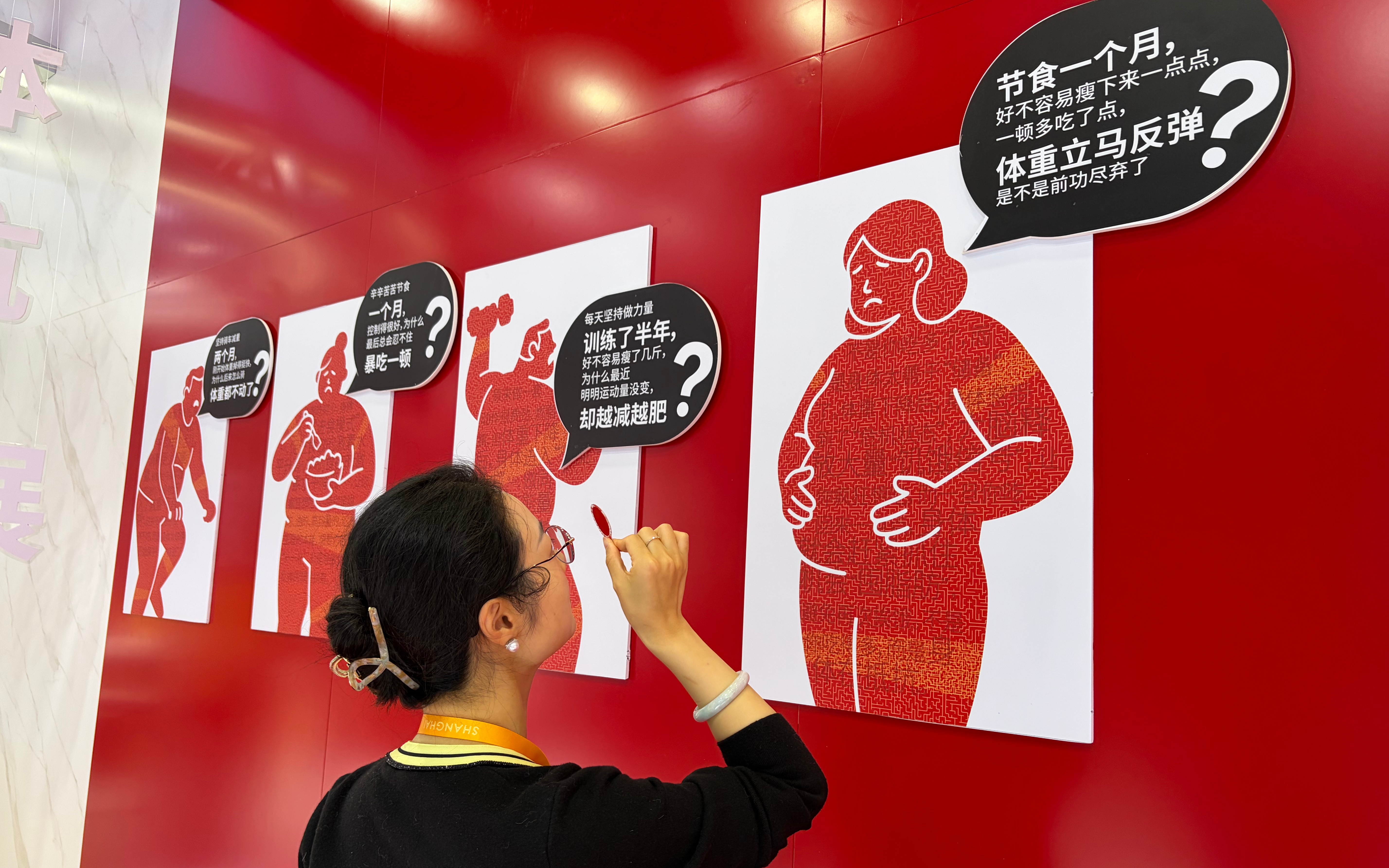 礼来在本届进博会上推出“身体抵抗解码展”,以可视化方式揭示减重过程中的“代谢适应”机制——当体重下降,身体可能启动“进食模式”与“节能模式”,导致食欲失控、平台期顽固、运动效果受限,减重及其长期维持变得异常艰难。参观者需手持一个红色的小圆片,便能看清墙上四副“胖人图”上的文字,了解代谢适应机制。该展览旨在打破“减重失败源于意志薄弱”的刻板印象,强调这一困境背后是常被忽视的生理机制“身体抵抗”。因此,寻求专业的医学干预以理解并破解这一机制变得至关重要。礼来还特地放置了一个巨大的被黄色丝带捆绑的充气红色人偶,以此暗示减重过程中所遭遇的多重困境。