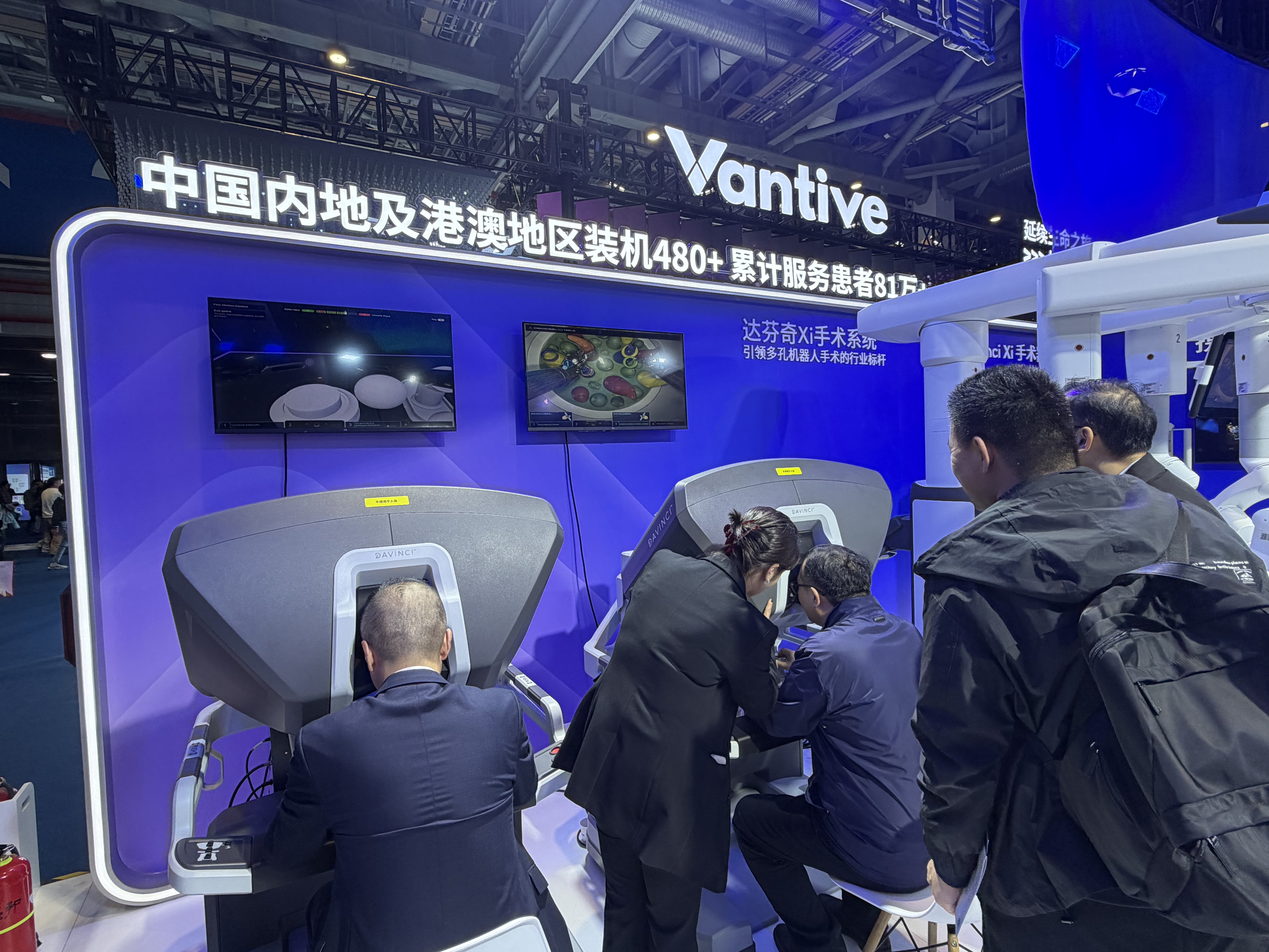 复星医药展台则摆放着一台达芬奇Xi手术机器人和尚未上市的达芬奇SP手术系统(单通道内窥镜手术控制系统),通过模拟腹腔镜手术的场景,让参观者现场体验全球领先的手术机器人的精妙之处。手术模拟通过“套圈游戏”的方式进行,参观者通过操控手术机器人的控制杆,将直径约1厘米的橡皮圈套到柱子上,可以清晰地感受到“手到,机器人的动作就到”的手部高贴合度以及仪器的高精密度。
