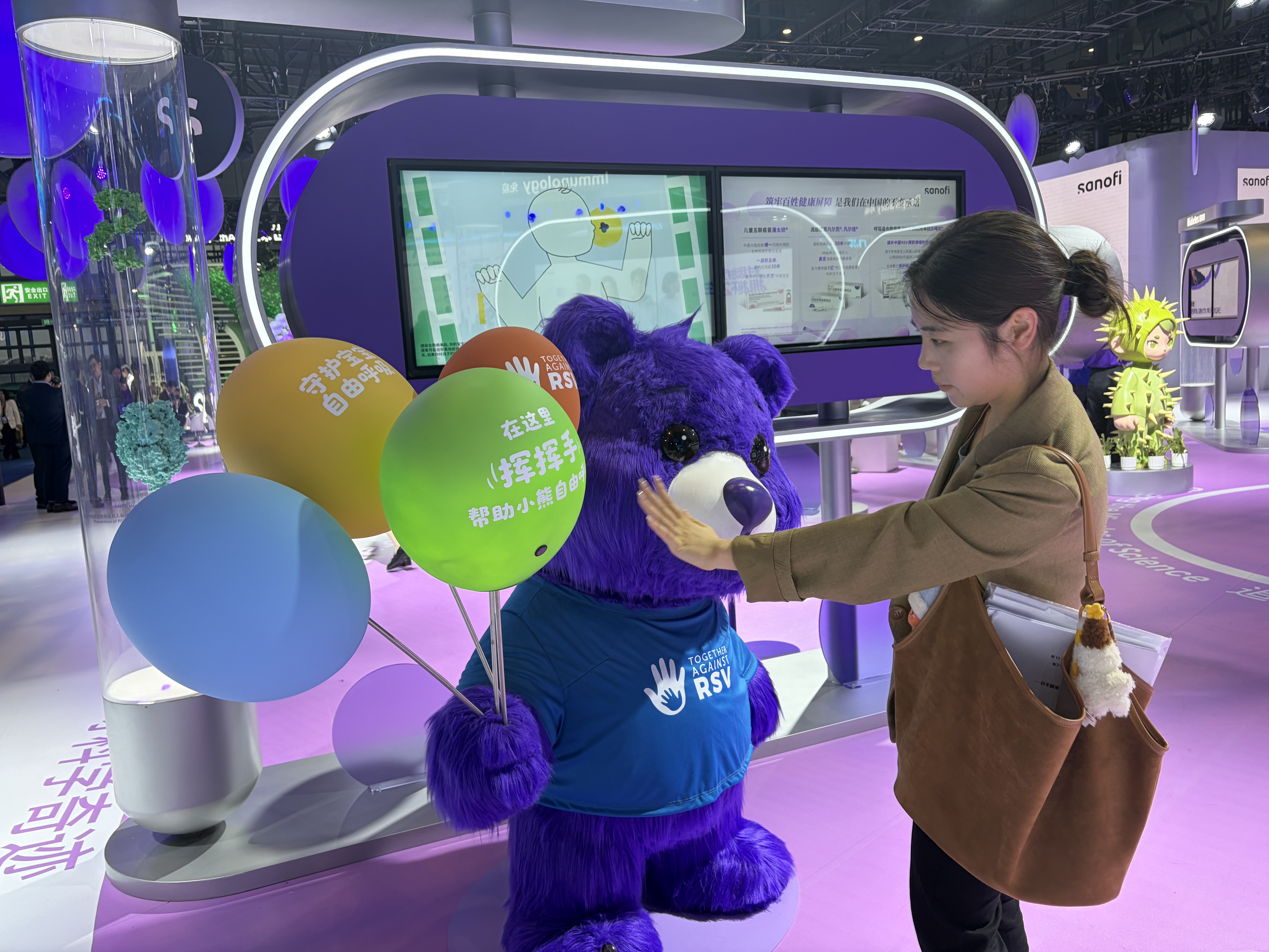 在赛诺菲展台,一只手举气球的可爱紫色大熊,可以让参观者体会一下被合胞病毒感染的患儿的呼吸状态。展牌上写着“一岁内的宝宝,合胞病毒严重感染后,肺功能受损可能长达数年”。当参观者踏入感应范围(1米),大熊的呼吸会变得急促,肉眼可见胸腔起伏频率变化,并伴有急促的呼吸声、憋喘声,同时它手中的绿色气球闪动,吸引参观者参与互动。当参观者对着气球挥手,感应触发,大熊的胸部起伏渐渐平缓直至恢复正常呼吸(持续10秒),同时所有气球闪动,像是在为参观者的“救赎”而欢呼。该互动也在提醒参观者合胞病毒感染的危险性和预防的重要性,推荐婴儿出生后的第一个合胞病毒感染季来临前完成合胞病毒抗体针注射。