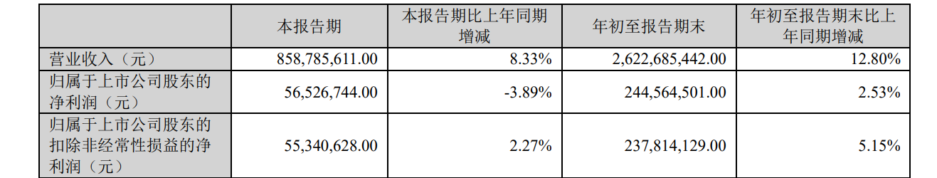 今年前三季度,百亚股份实现营业收入26.23亿元,较上年同期增长12.8%,净利润约2.45亿元,较上年同期增长2.53%。其中,第三季度该公司实现营业收入8.59亿元,较上年同期增长8.33%,净利润却同比下滑3.89%至5652.67万元。