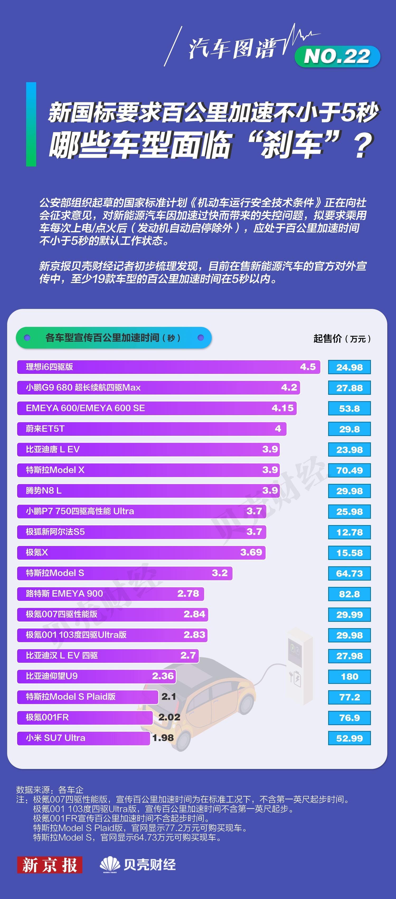 首页 > 数读 汽车图谱㉒|百公里加速不小于5秒新规下,哪些车面临“刹车”? 2025-11-14 11:33:22 记者:张冰 王琳琳 白昊天 林子 任婉晴 编辑:王进雨 新京报贝壳财经记者初步梳理发现,目前在售新能源汽车的官方对外宣传中,至少19款车型的百公里加速时间在5秒以内。 统筹 廖爱玲 任娇新京报贝壳财经记者 张冰 王琳琳 白昊天 林子设计 任婉晴编辑 王进雨校对 杨利 31 +1 微信 我要评论 登录 热点 AI浪潮录|智谱刘德兵:极致技术追求与广泛链接生态才是护城河 20小时前 黄金“围城”内外:“北京水贝”主播摇人,有人匆匆下车后再抄底 21小时前 何剑波辞任五矿地产董事会主席 执掌7年遇私有化退市转折 14小时前 长期定存不香了?实探多家银行5年定存产品下架 利率倒挂成常态 21小时前 杭州铜师傅欲赴港上市:业务结构单一,高度依赖线上销售渠道 17小时前 最新 腾讯高管详解三季报:AI投入转向研发,游戏出海寻求增长 36分钟前 B站三季度营收同比增5%,移动游戏收入增速放缓 36分钟前 京东物流三季度收入同比增长24.1%,海外业务成增长重要引擎 51分钟前 京东集团第三季度收入2991亿元,年度活跃用户破7亿 51分钟前 汽车图谱㉒|百公里加速不小于5秒新规下,哪些车面临“刹车”? 1小时前 汽车图谱㉒|百公里加速不小于5秒新规下,哪些车面临“刹车”? 1小时前