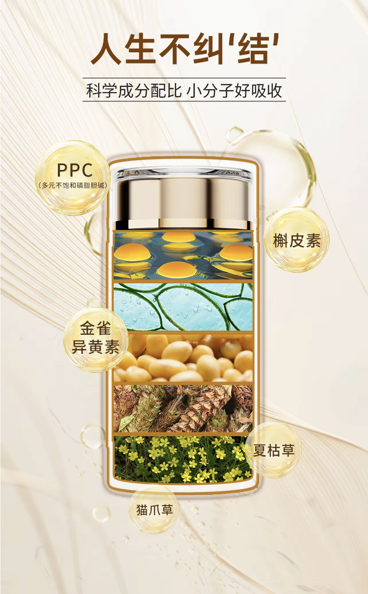 除了对功效的宣传,该产品还宣称含有五大成分,包括PPC400mg(多元不饱和磷脂胆碱)、槲皮素200mg、夏枯草提取物100mg、猫爪草提取物100mg、金雀异黄素20mg。这些成分究竟是什么?对主播宣称的散结功效真有帮助吗?