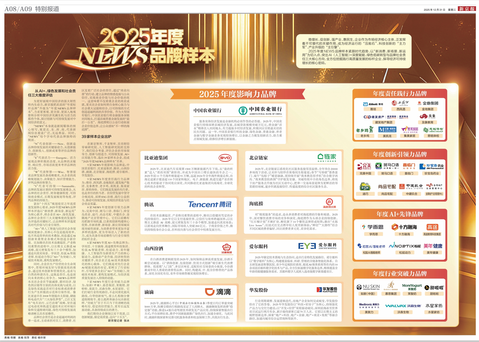 2025年12月31日新京报A8-A9版《2025年度NEWS品牌样本》。