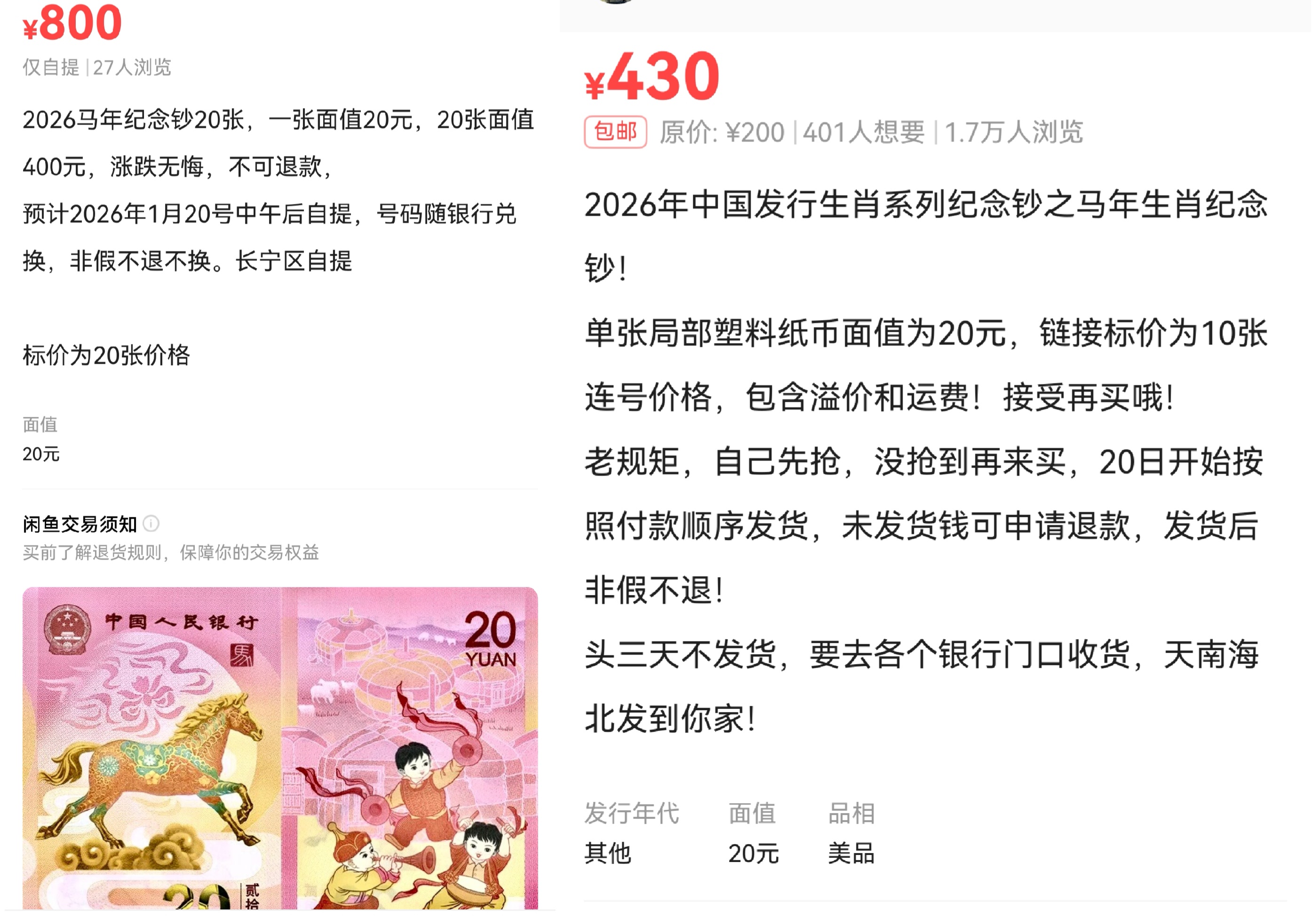 1月14日上午,贝壳财经记者在闲鱼上看到,已有卖家标出10张连号纪念钞430元,并表示“前三天不发货,要去各个银行门口收货”“普通纪念钞20张800元,号码随银行兑换,1月20日中午即可自提”。贝壳财经记者计算,溢价已达100%。