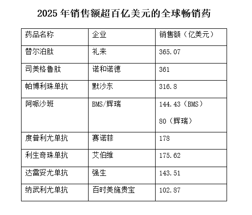 近期,全球各大药企相继披露2025年财报,2025年全球畅销药中,销售额超百亿美元的品种相继出炉。诺和诺德旗下黑马司美格鲁肽在2025年一季度反超默沙东的帕博利珠单抗(俗称“K药”)后,短暂登顶“药王”,但最终被礼来的替尔泊肽反超。三款药2025年销售额均超300亿美元。此外,百时美施贵宝(BMS)的纳武利尤单抗(俗称“O药”)、强生的达雷妥尤单抗、艾伯维的利生奇珠单抗、赛诺菲的度普利尤单抗、BMS/辉瑞的阿哌沙班2025年销售额均超百亿美元规模。