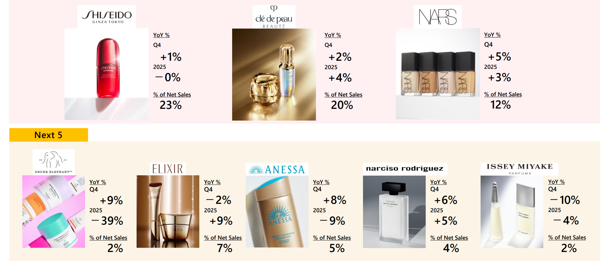 相比之下,五大未来品牌中,除了怡丽丝尔、纳西索·罗德里格斯的净销售额分别录得9%和5%的增长,其余品牌均出现不同程度下滑,给资生堂集团的整体业绩增长蒙上阴影。其中,安热沙、三宅一生分别下滑9%和4%,醉象再次成为跌幅最大的品牌,净销售额同比减少了39%。
