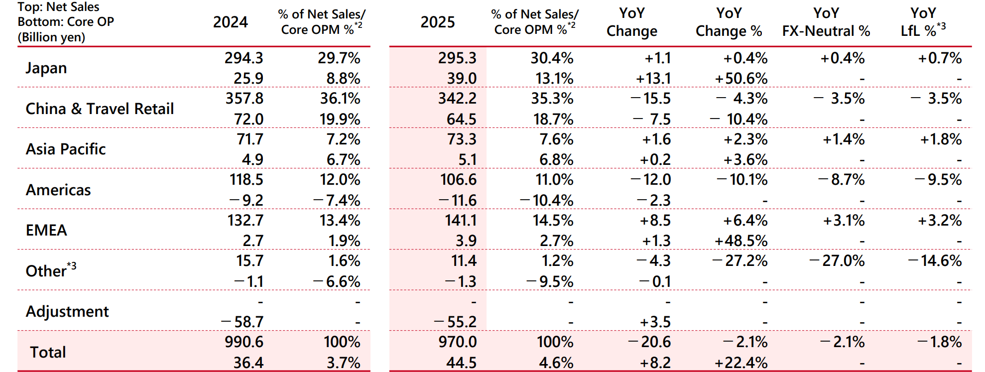 除了核心品牌失守,2025年,资生堂集团在各大区域市场的表现呈现分化态势。