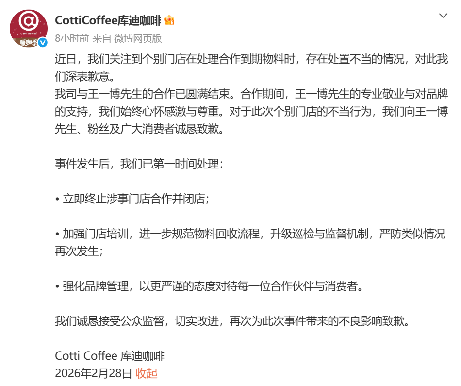 新京报讯(记者王子扬)2月28日,针对有门店销毁前代言人王一博合作物料引发的争议,连锁咖啡品牌库迪咖啡发布致歉声明称,公司与王一博的合作已圆满结束。对于此次个别门店的不当行为,库迪咖啡向王一博、粉丝及广大消费者诚恳致歉。