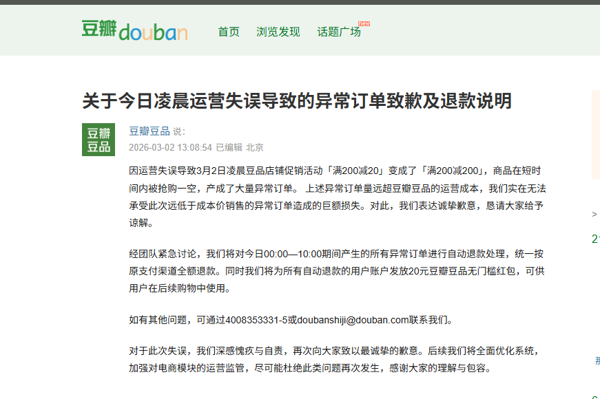 根据说明,因运营失误导致3月2日凌晨豆品店铺促销活动「满200减20」变成了「满200减200」,商品在短时间内被抢购一空,产成了大量异常订单。“上述异常订单量远超豆瓣豆品的运营成本,实在无法承受此次远低于成本价销售的异常订单造成的巨额损失。对此,我们表达诚挚歉意,恳请大家给予谅解。经团队紧急讨论,我们将对今日00:00—10:00期间产生的所有异常订单进行自动退款处理,统一按原支付渠道全额退款。同时我们将为所有自动退款的用户账户发放20元豆瓣豆品无门槛红包,可供用户在后续购物中使用。”
