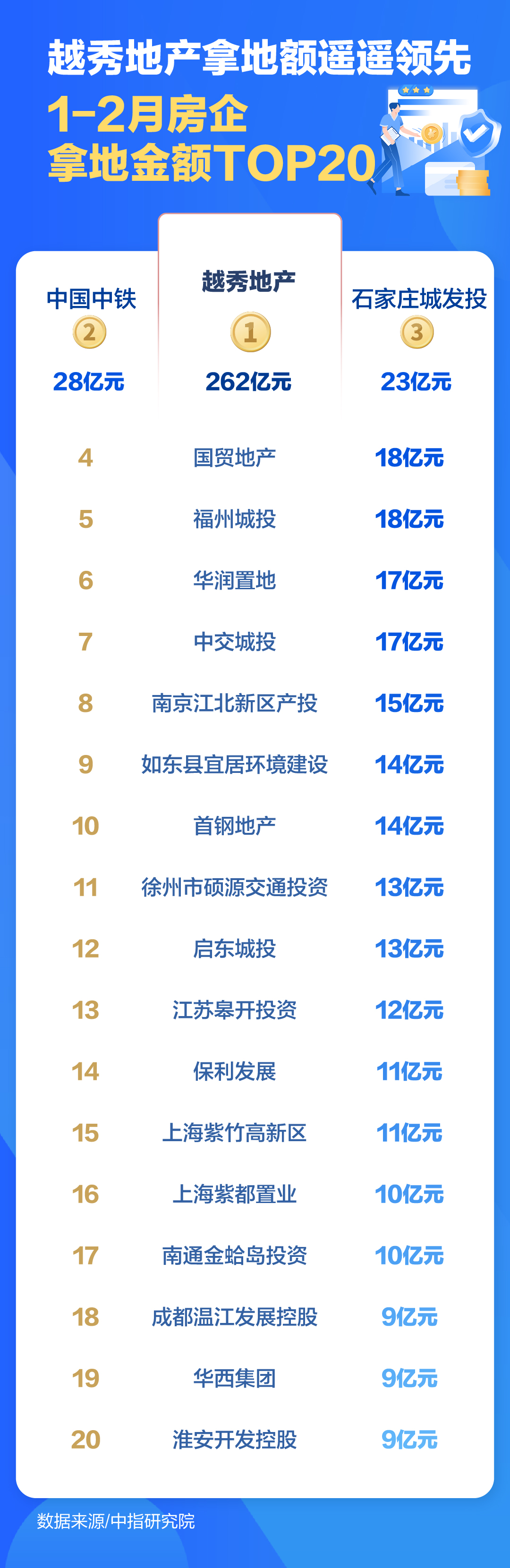 凭借斥资236亿元斩获广州新单价地王,越秀地产以262亿元拿地额、770亿元新增货值强势领跑全行业。