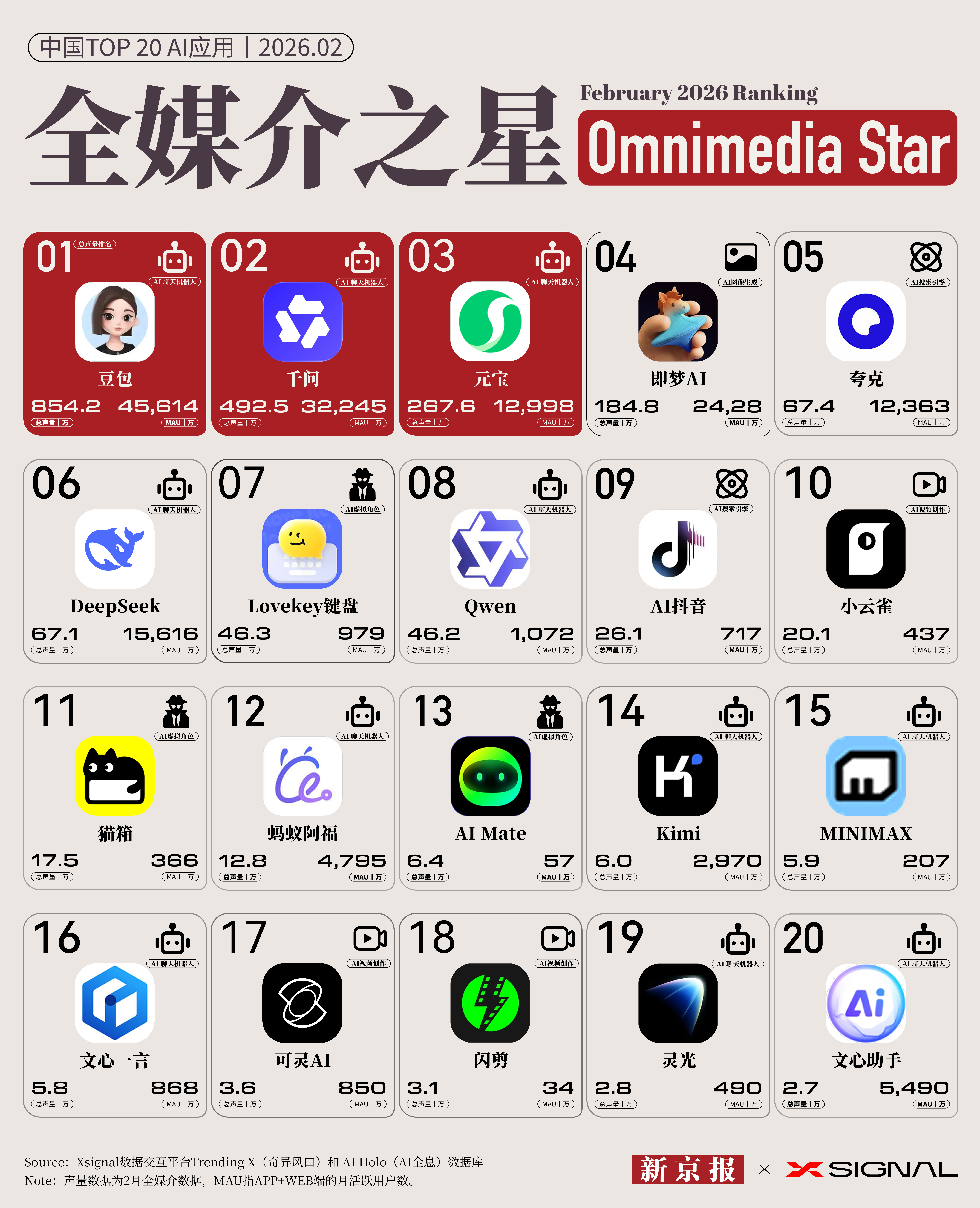 “全媒介之星”榜单由新京报AI研究院与Xsignal联合编制,依据全媒介声量评出2026年2月国内最具影响力的20款AI应用。榜单采用双指标呈现:左侧红色柱状图代表全媒介声量(基于用户在新闻、社交、短视频、垂直社区及财经等800余个平台的内容生成量测算),反映市场关注度与潜在增长空间;右侧蓝色柱状图显示月活用户(MAU)数据,体现AI应用当期的实际用户规模与活跃度。