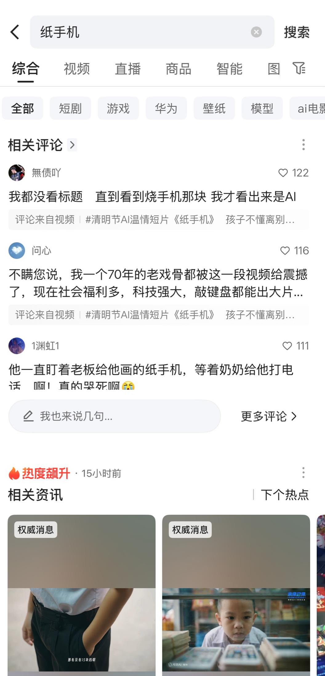 有人泪崩,有人想起了已经离开的亲人,还有网友说:“这个清明,最没有人味的AI,拍出了最有人味的短片。”他们彼此陌生,却在这一刻,共同抵达同一种思念。每个人都在这里,收到了一部属于自己的“纸手机”。