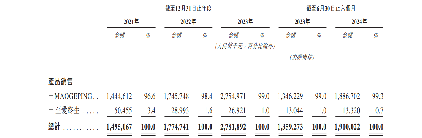在2025年年报中,毛戈平并未详细披露两个品牌的具体销售数据,仅称作为旗舰品牌的MAOGEPING贡献了主要的产品销售收入。而据此前公告,2024年上半年,MAOGEPING的产品销售收入为18.87亿元,占公司产品销售总收入的99.3%,至爱终生的占比仅为0.7%。2021年至2023年,MAOGEPING的产品销售收入分别占公司产品销售总收入的96.6%、98.4%和99%。