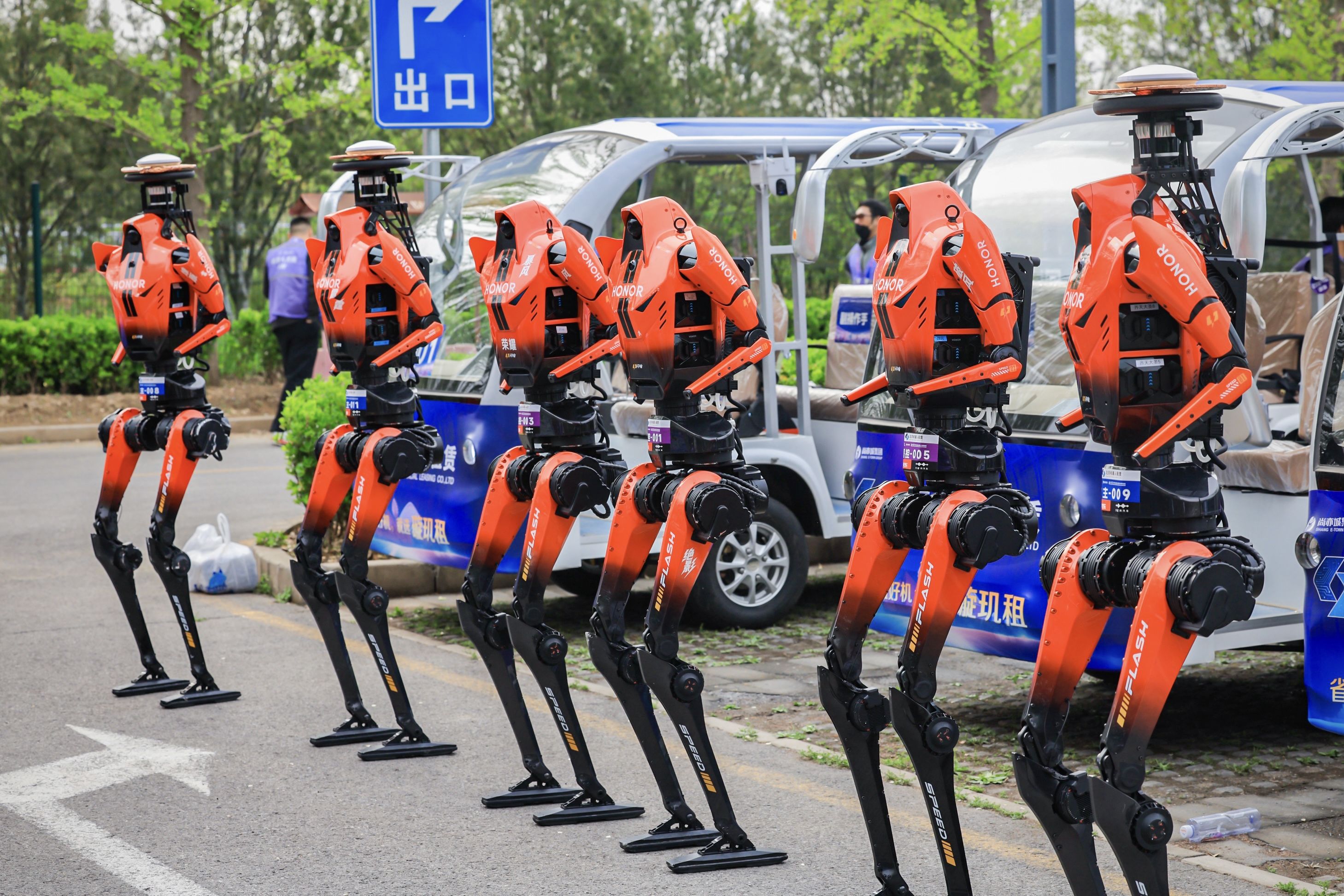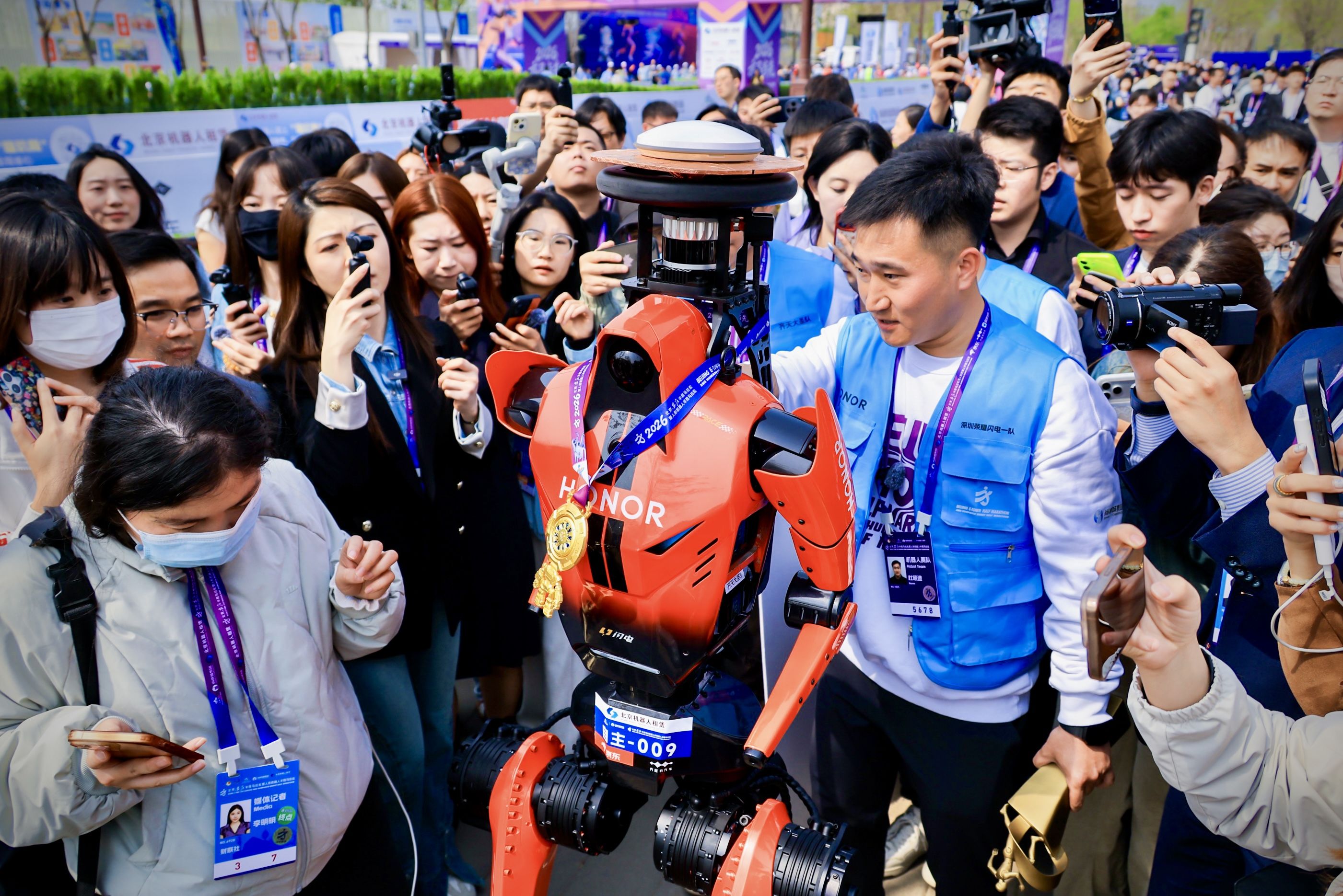 4月19日,2026北京亦庄半程马拉松暨人形机器人半程马拉松鸣枪起跑,102支赛队、超300台人形机器人在21.0975公里赛道上竞逐,最终荣耀“闪电”强势问鼎,六台机器出战便包揽赛事前六。