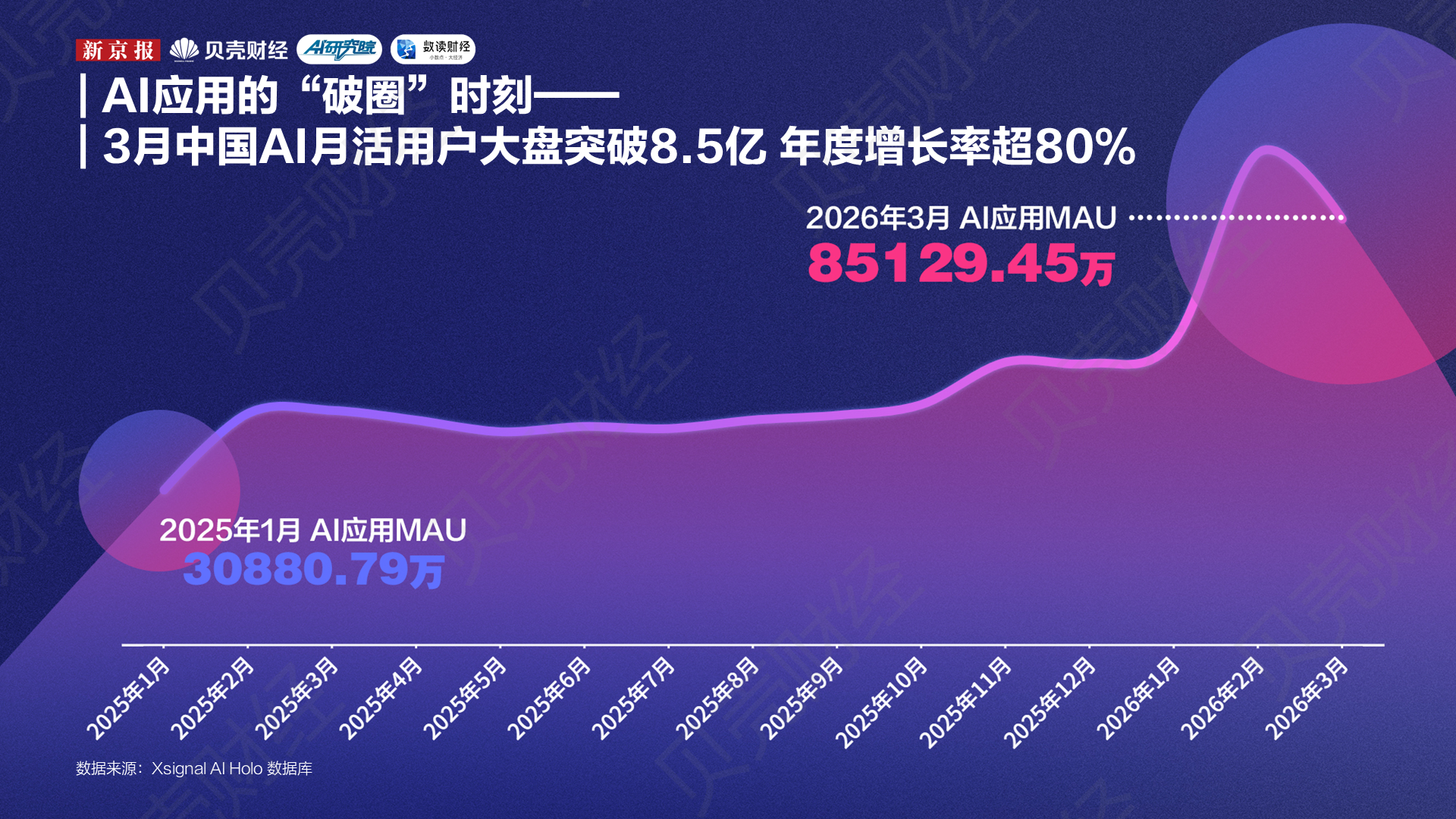这一轮围绕补贴、导流和营销展开的集中动作,迅速推高了中国AI用户规模。根据Xsignal AI Holo(AI全息)数据库数据,2026年3月,中国AI应用月活用户总规模已超8.5亿,过去一年同比增长81.71%。这也意味着,在大厂“合力”下,中国AI应用在极短的时间内完成了从科技领域向大众生活的“破圈”。