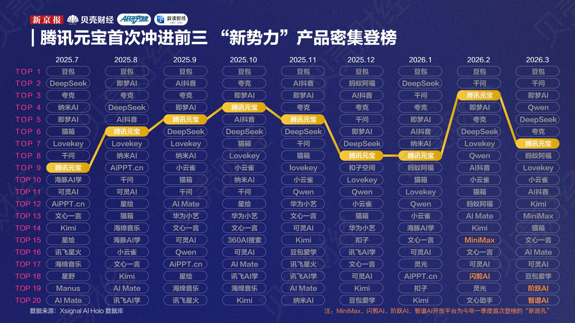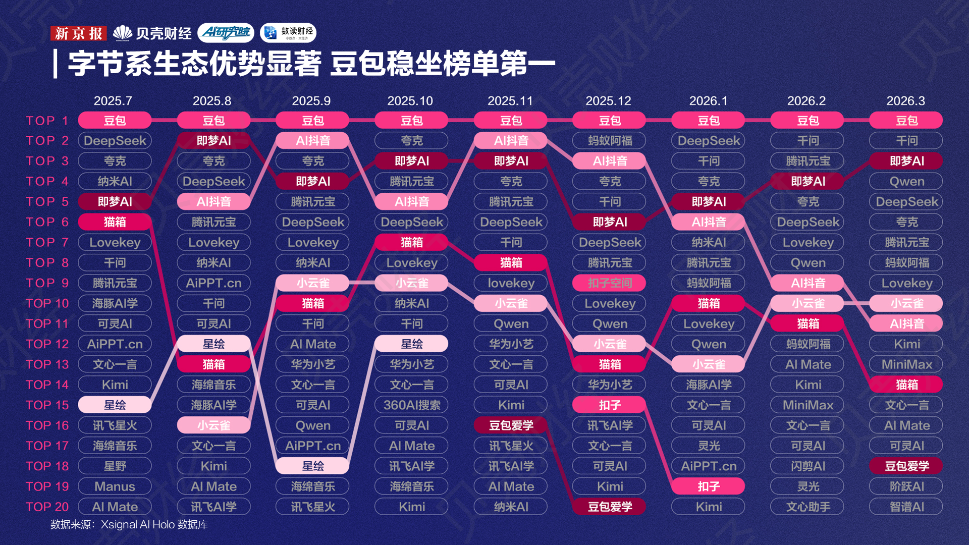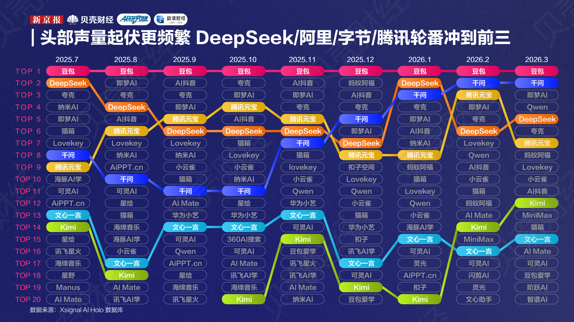 自去年7月到今年3月,新京报AI研究院与Xsignal联合推出的“全媒介之星”榜单已连续发布9期。从这9期榜单来看,一个比较明显的变化是,榜单上的席位正在向两端集中:一端是头部大厂继续做大,另一端是大厂外的创企“新势力”明显回升,而“腰部”厂商AI应用的声量则在被进一步挤压。