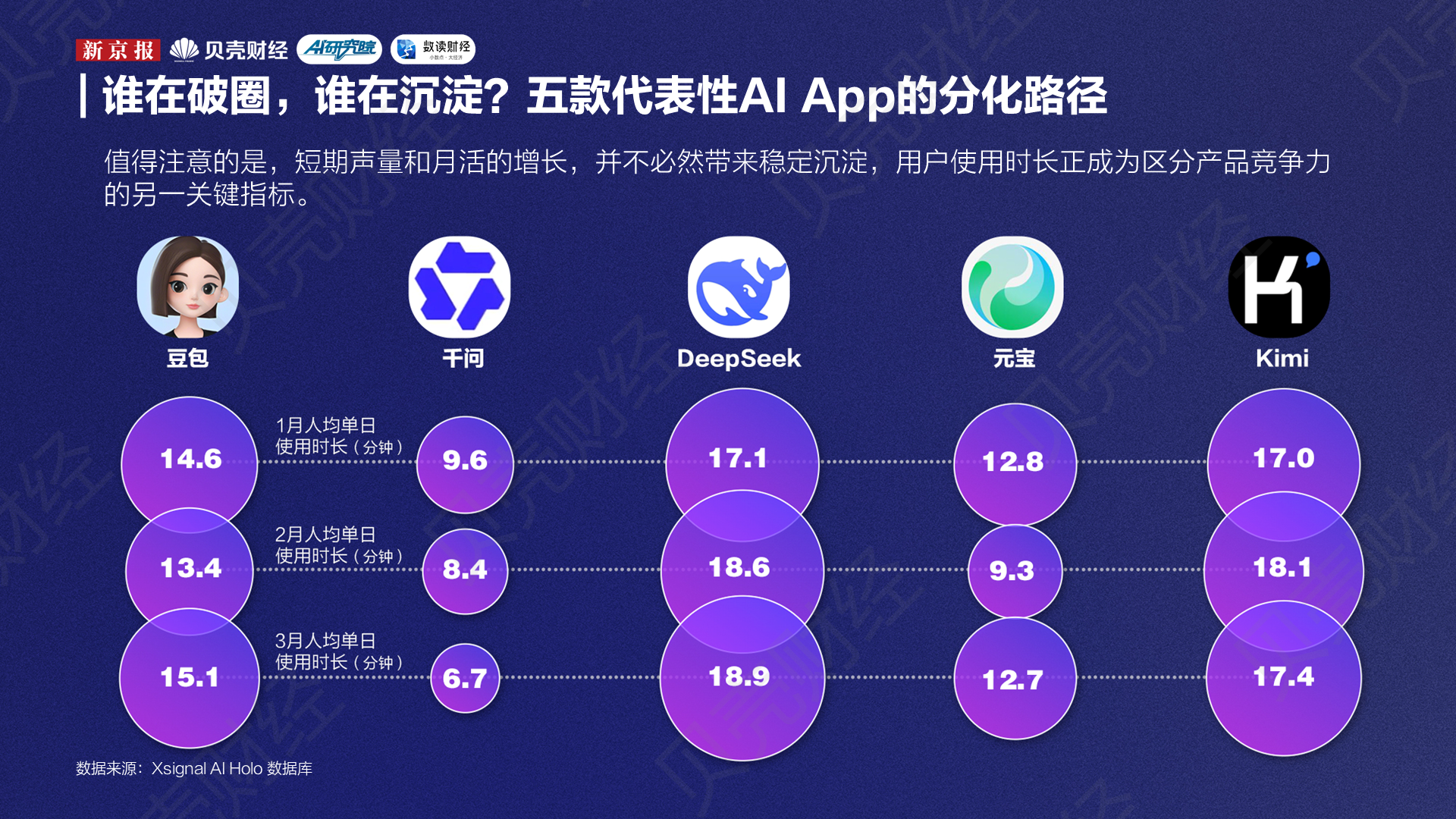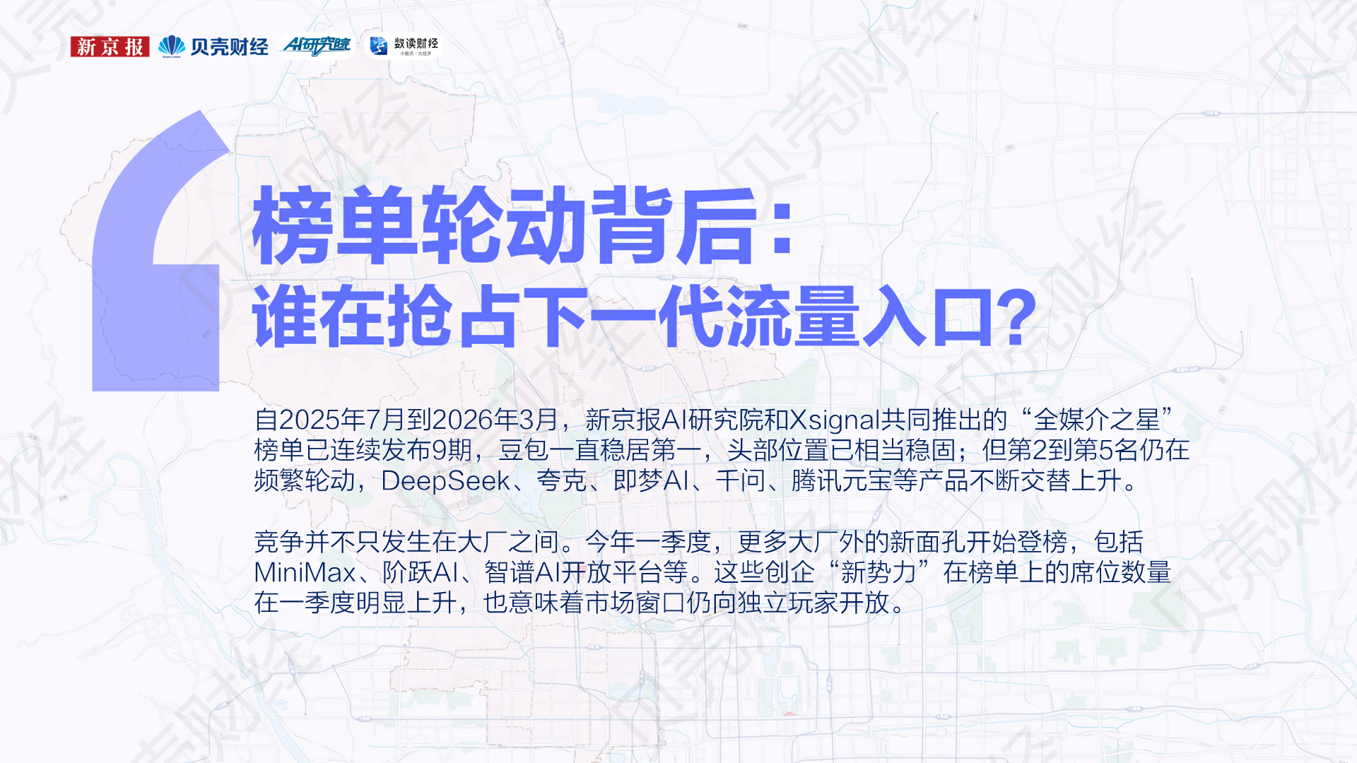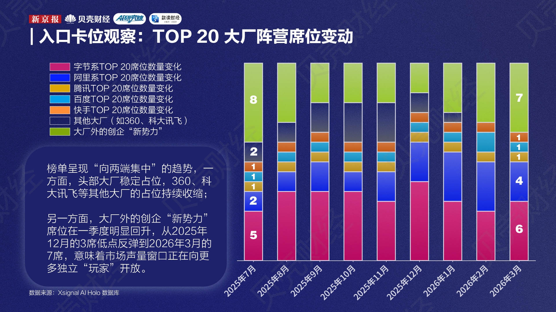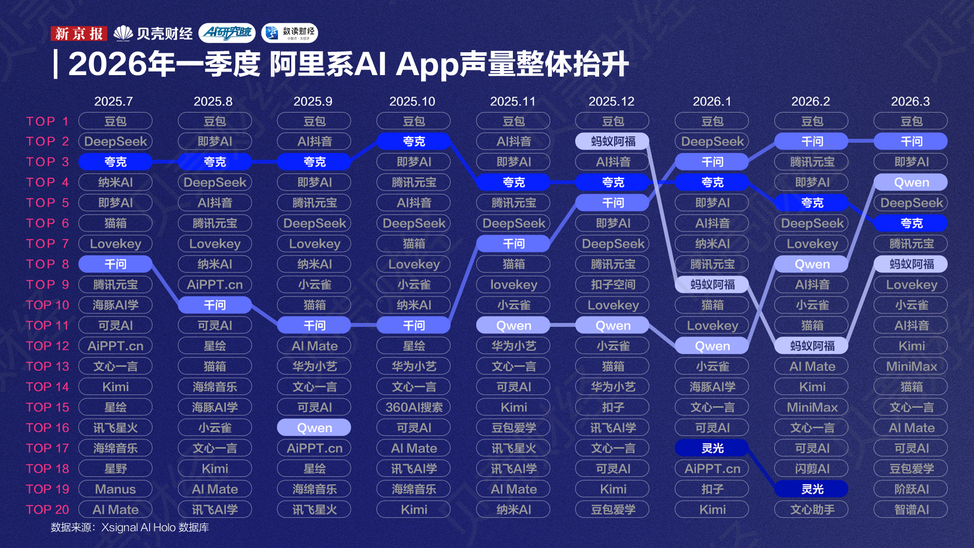 自去年7月到今年3月,新京报AI研究院与Xsignal联合推出的“全媒介之星”榜单已连续发布9期。从这9期榜单来看,一个比较明显的变化是,榜单上的席位正在向两端集中:一端是头部大厂继续做大,另一端是大厂外的创企“新势力”明显回升,而“腰部”厂商AI应用的声量则在被进一步挤压。