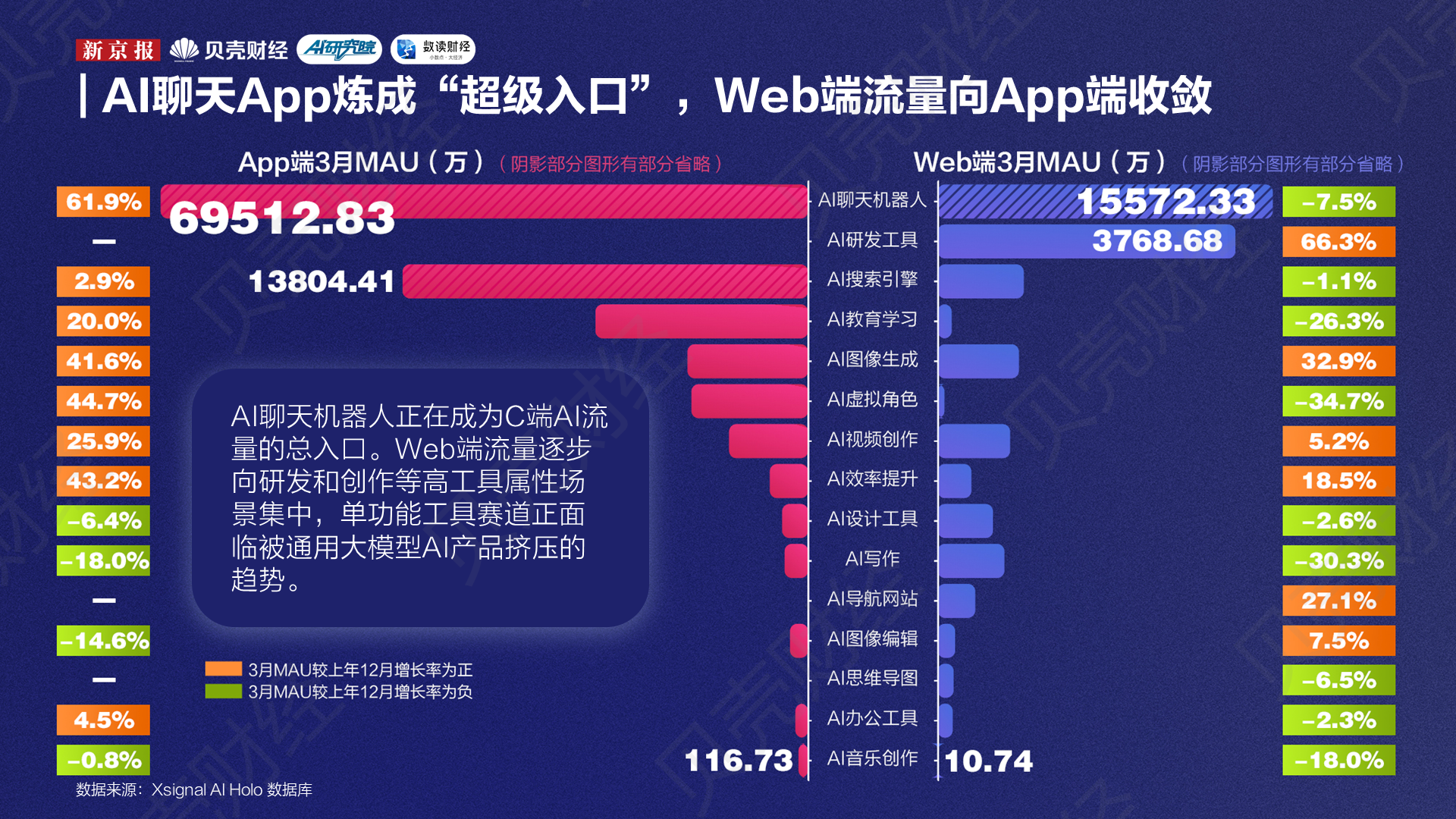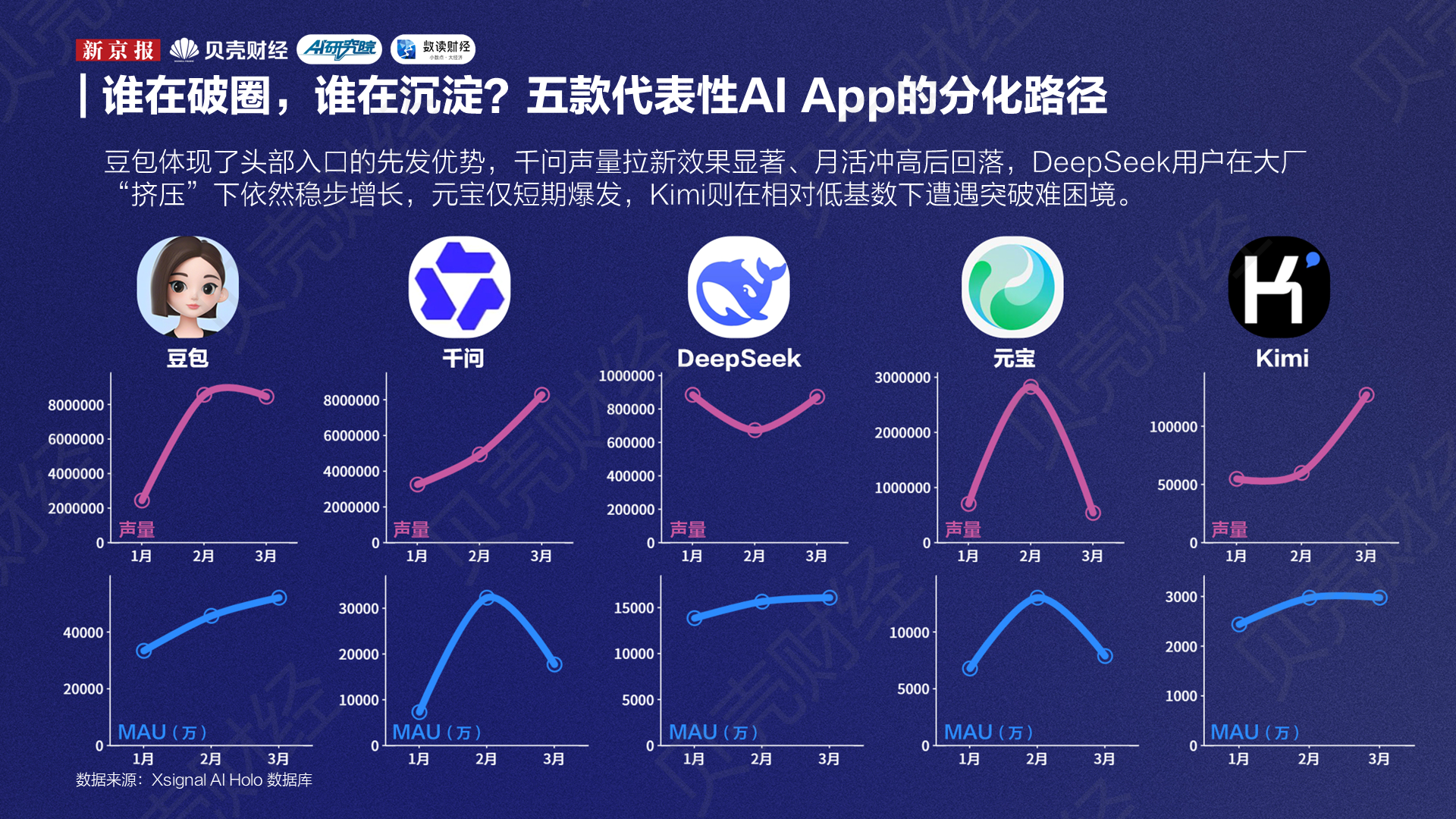 在此背景下,新京报AI研究院与Xsignal联合编制的“全媒介之星”榜单,提供了一个观察市场变化的重要窗口。榜单以全媒介声量与月活用户数(MAU)两项指标同时呈现。全媒介声量基于用户在新闻、社交、短视频、垂直社区及财经等800余个平台上的内容生成量测算,反映产品在舆论场中的市场关注度及潜在增长空间;月活用户数则对应应用当期真实的用户规模与活跃度,更接近产品在实际使用层面的竞争力。