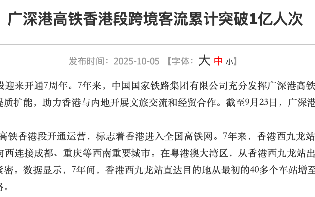 广深港高铁香港段跨境客流累计突破1亿人次4小时前